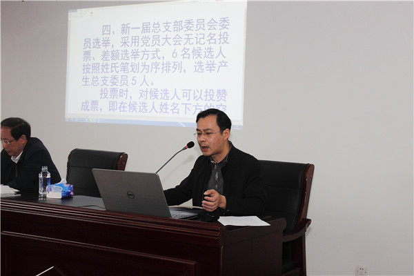 在會議上,屠書記首先對第五屆總支委任職期間公司黨建工作和總支部換屆選舉有關(guān)前期各項(xiàng)準(zhǔn)備工作作了要點(diǎn)回顧講話。按照公司黨建2018年度工作計(jì)劃,從3月23日總支委召開會議研究部署換屆改選有關(guān)具體工作起,相關(guān)工作按計(jì)劃規(guī)范有序推進(jìn)。在對總支委員候選人推薦工作上,分別經(jīng)總支委提名推薦、總支部黨員大會和各支部黨員大會討論醞釀推薦、召開職工群眾座談會聽取意見建議、換屆選舉總支委候選人公示進(jìn)一步聽取意見等程序,最終確定了總支委候選人的報(bào)批名單。會上,屠書記就上級黨工委(區(qū)直屬機(jī)關(guān)〔企業(yè)〕黨工委)同意我總支部換屆選舉候選人等有關(guān)批復(fù)文件進(jìn)行了宣讀。