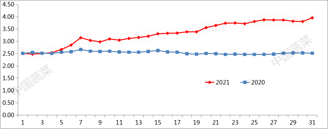 月內(nèi)的最高價(jià)是3.96元/公斤(10月31日),月內(nèi)的最低價(jià)是2.48元/公斤(10月2日),比9月份的2.26元/公斤上漲9.73%。最高價(jià)比最低價(jià)高出59.68%,月內(nèi)的最低價(jià)出現(xiàn)在月初,最高價(jià)出現(xiàn)在月末,說(shuō)明10月份蔬菜價(jià)格整體呈現(xiàn)連續(xù)上漲的態(tài)勢(shì),漲幅巨大。